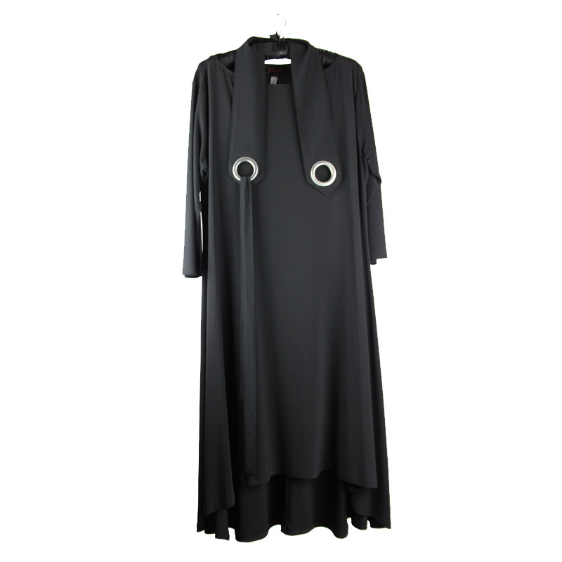 Just one of Habits' perfect little black dresses. This classic black dress in black stretch lycra has a waistband with silver eyelet detail in the waist and high low length.