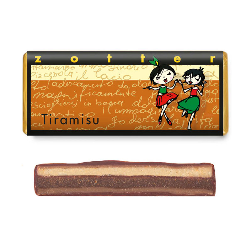 Più bella cosa non c'è : a layer of mascarpone enhanced with almond praline, white chocolate and genuine Bourbon vanilla, with a second, intense coffee chocolate layer made from dark chocolate, a coffee couverture, freshly ground Zotter coffee from our in-house roastery and a generous dash of rum, coated top and bottom with a wafer-thin coffee couverture and covered all over in a fine milk chocolate coat with a 50% cocoa content.