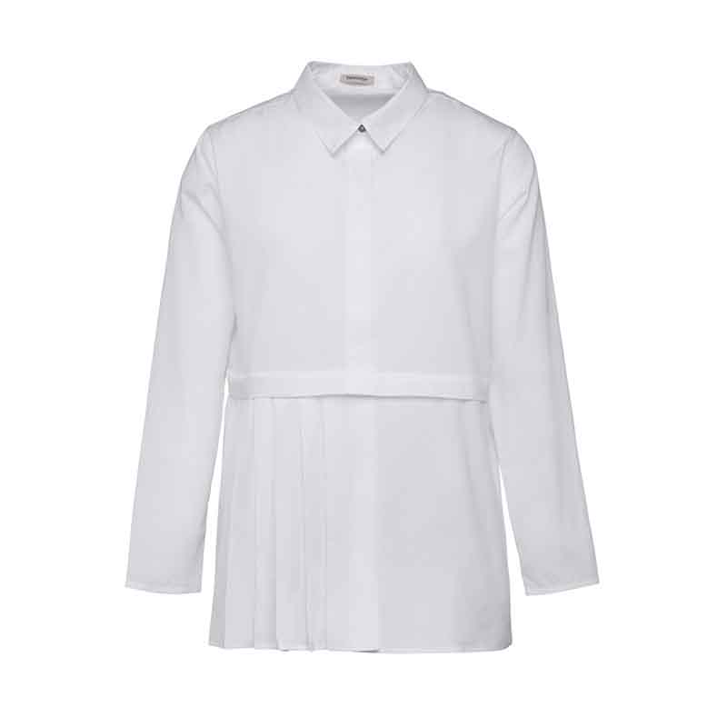 Asymmetrical, white cotton, buttoned up shirt with hidden button placket. Right bottom layer pleated.