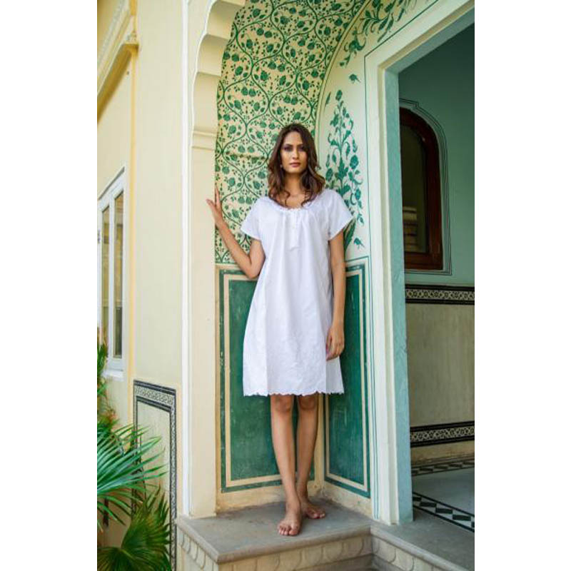 Prettiest nightdress in pure cotton poplin with hand-cut scallop trim around the neck and a deep embroidered border all around the hem. Real pearl buttons. Exquisite.