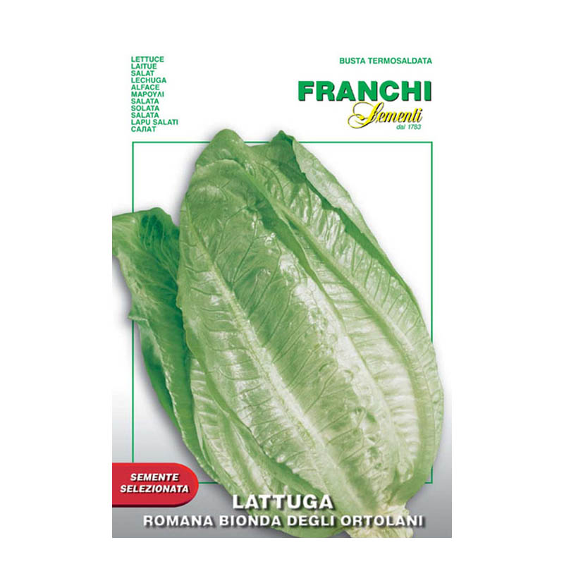 Lettuce Bionda Ortolani. A classic romaine lettuce with a large tight head and dark green crunchy leaves. 65 days. Like all romaines, it does best in spring and fall. Can grow in summer for baby lettuce, and even head lettuce in cooler climates. Start from 5-6 week old transplants or direct seed, 2-3 seeds per foot at a row spacing of 12-16 inches. Water well until seeds germinate, thin to the best plant and keep well watered. 7 gram packet.