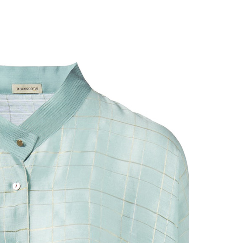 Soft oversized silk mix shirt featuring checks in gold metallic strips.  Banded silk collar with close running gold metallic stitches. Front is buttoned with small MOP buttons with one gold metallic button at neckline.  Side slits and contrasting ajours enhance the piece.  Works equally well worn as a shirt on its own or as a jacket.
