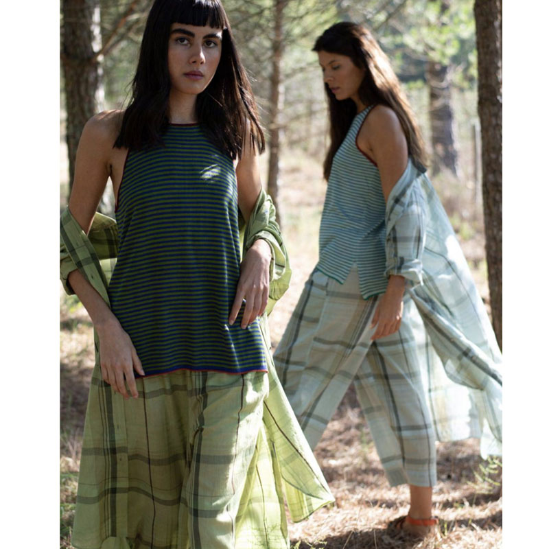 Wide leg, oriental style trousers with adjustable elastic waist in marble tartan. 100% cotton. Featuring an exclusive TM logo embroidery on the pocket. Contemporary and elegant.