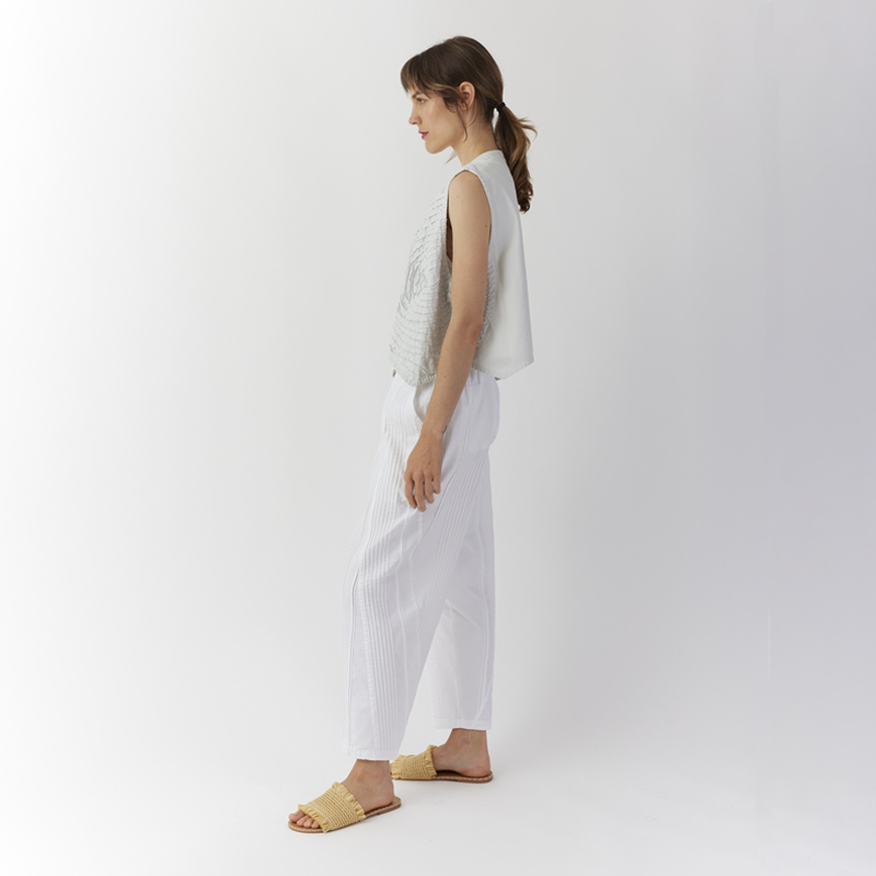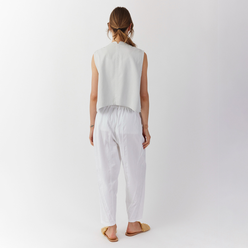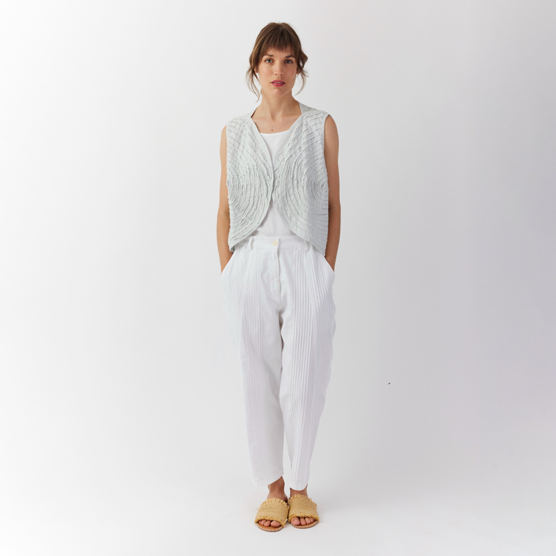 Inspired by woodblock prints of the artist Hiroshige, this waistcoat layers cotton jersey over soft katsuragi, a medium cotton with a soft handle that doesn't wrinkle easily. Curved channels are stitched into the fabrics, and the top layer of jersey is sheared to create tactile raw edges with an airy illustrative feel. The shape is echoed in the curved silhouette of the waistcoat. Finished with a notched back. Throw on over a vest or long-sleeve tee.
