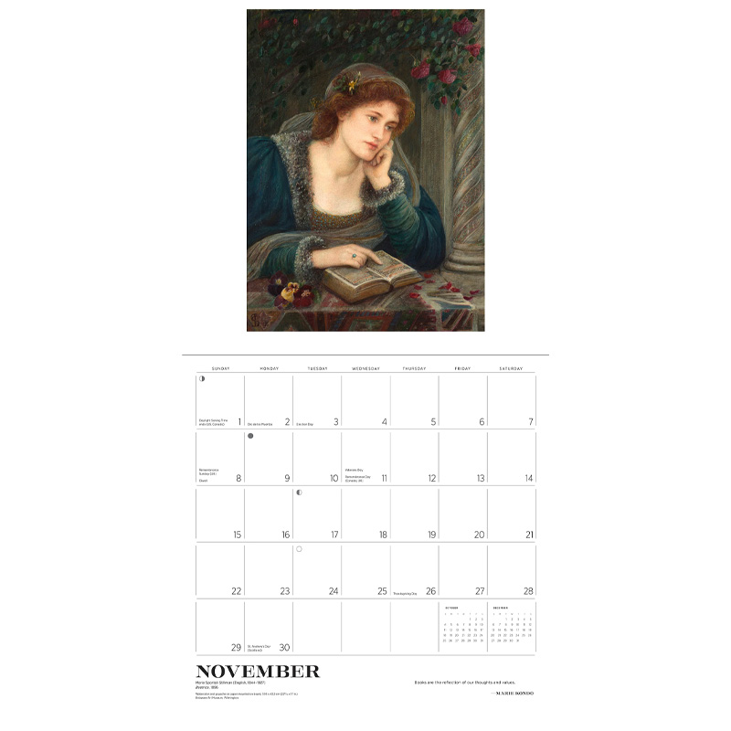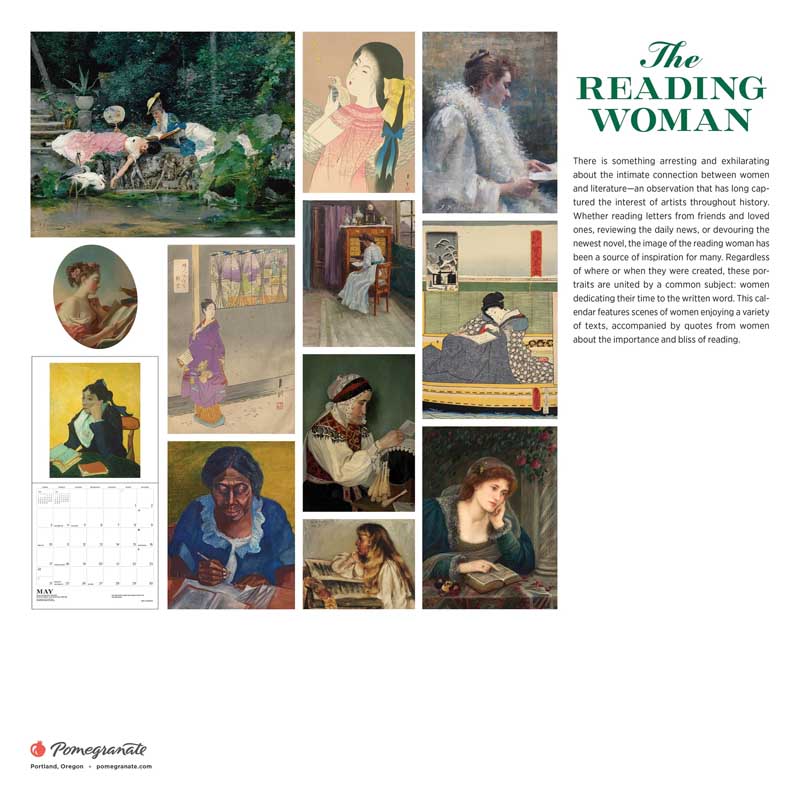There is something arresting and exhilarating about the intimate connection between women and literature—an observation that has long captured the interest of artists throughout history. Whether reading letters from friends and loved ones, reviewing the daily news, or devouring the newest novel, the image of the reading woman has been a source of inspiration for many. Regardless of where or when they were created, these portraits are united by a common subject: women dedicating their time to the written word. This calendar features scenes of women enjoying a variety of texts, accompanied by quotes from women about the importance and bliss of reading.