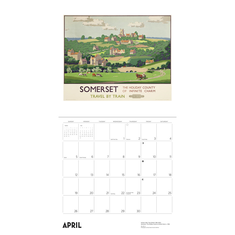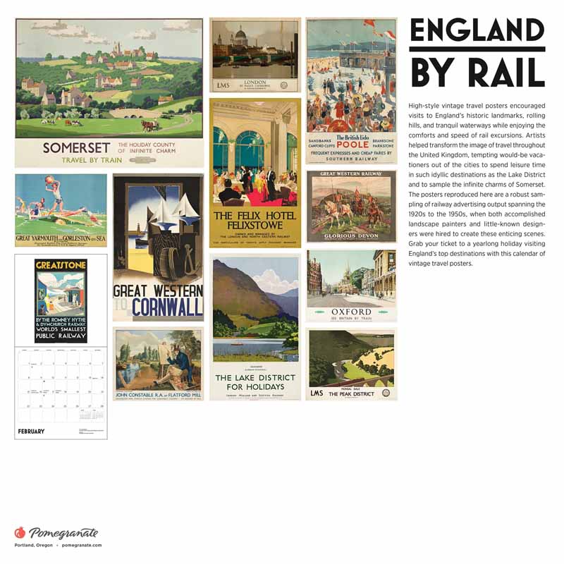 High-style vintage travel posters encouraged visits to England’s historic landmarks, rolling hills, and tranquil waterways while enjoying the comforts and speed of rail excursions. Artists helped transform the image of travel throughout the United Kingdom, tempting would-be vacationers out of the cities to spend leisure time in such idyllic destinations as Newquay on the Cornish coast and the all-season pleasures of Scarborough. The posters reproduced here are a robust sampling of railway advertising output spanning the 1920s to the 1950s, when both accomplished landscape painters and little-known designers were hired to create these enticing scenes. Grab your ticket to a yearlong holiday visiting England’s top destinations with this calendar of vintage travel posters