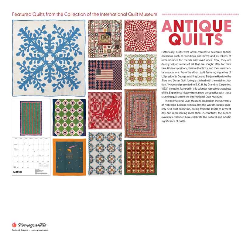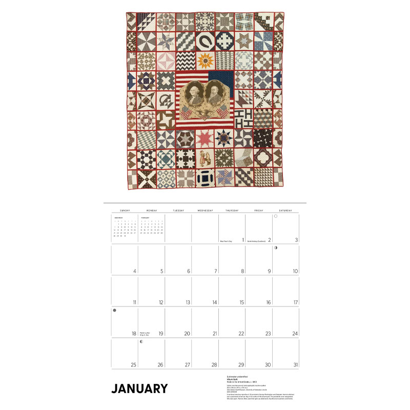 Historically, quilts were often created to celebrate special occasions such as weddings and births and as tokens of remembrance for friends and loved ones. Now, they are deeply valued works of art that are sought after for their beautiful compositions, their authenticity, and their sentimental associations. From the album quilt featuring vignettes of US presidents George Washington and Benjamin Harris to the Stars and Comet Quilt lovingly stitched with the natal inscription, “Made and presented to E. C. H. by grandma Carpenter, 1892,” the quilts featured in this calendar represent snapshots of life. Experience history from a new perspective with these stunning quilts from the International Quilt Museum. The International Quilt Museum, located on the University of Nebraska–Lincoln campus, has the world’s largest publicly held quilt collection, dating from the 1600s to present day and representing more than 65 countries; the superb examples collected here celebrate the cultural and artistic significance of quilts.