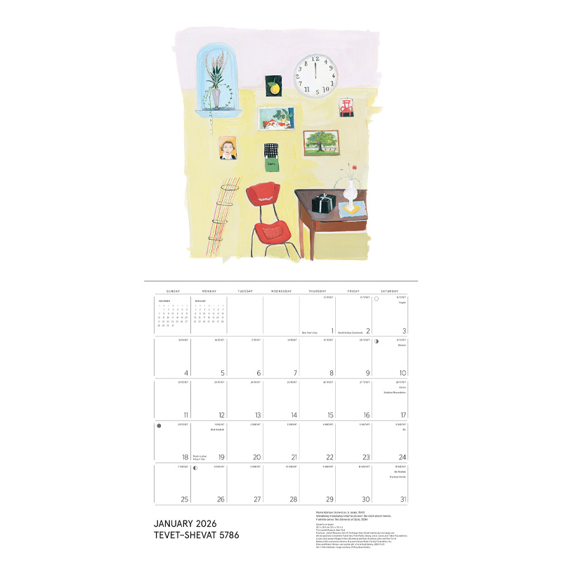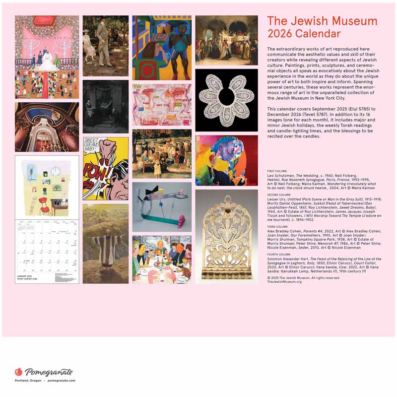 The extraordinary works of art reproduced here communicate the aesthetic values and skill of their creators while revealing different aspects of Jewish culture. Paintings, prints, sculptures, and ceremonial objects all speak as evocatively about the Jewish experience in the world as they do about the unique power of art to both inspire and inform. Spanning several centuries, these works represent the enormous range of art in the unparalleled collection of the Jewish Museum in New York City. This calendar covers September 2025 (Elul 5785) to December 2026 (Tevet 5787). In addition to its 16 images (one for each month), it includes major and minor Jewish holidays, the weekly Torah readings and candle-lighting times, and the blessings to be recited over the candles.