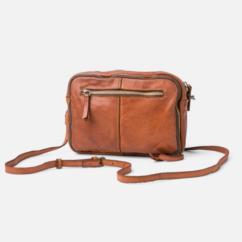 Washed cowhide shoulder bag. Multiple compartments with zipper closure. Adjustable shoulder strap. Internal pockets. Cotton lining.