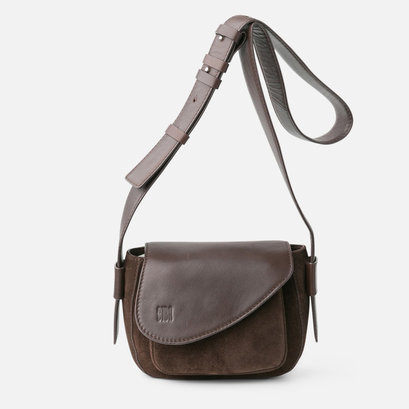 Washed cowhide and suede crossbody bag. Adjustable shoulder strap. Flap and magnet closure. Multiple external and internal pockets. Cotton lining.