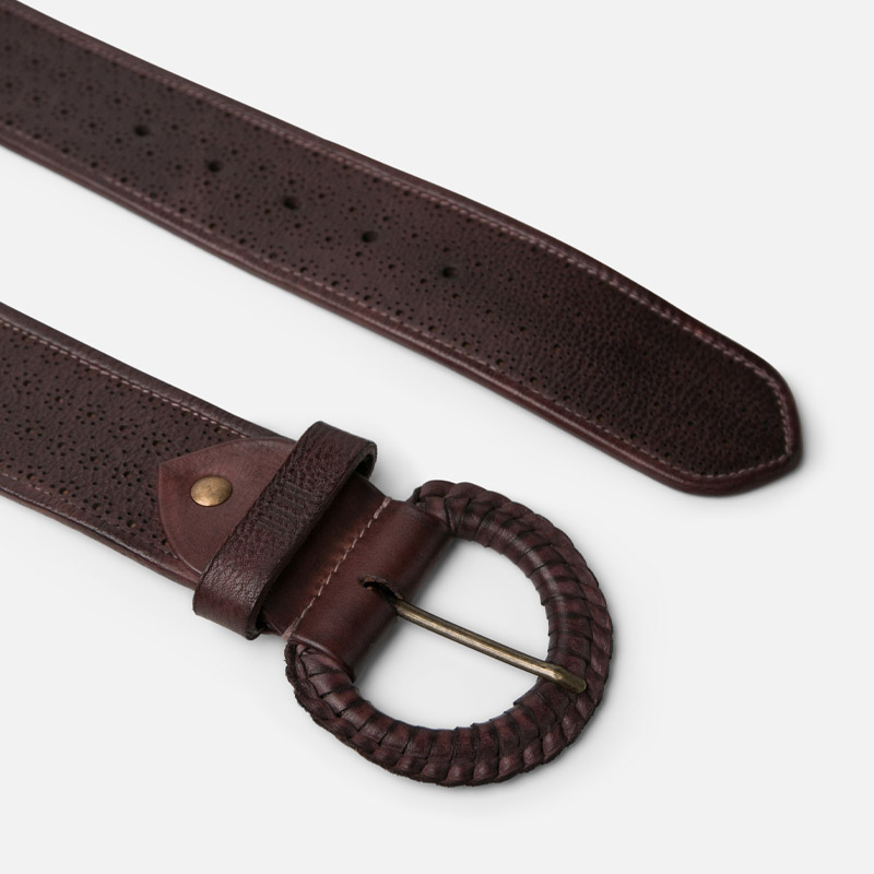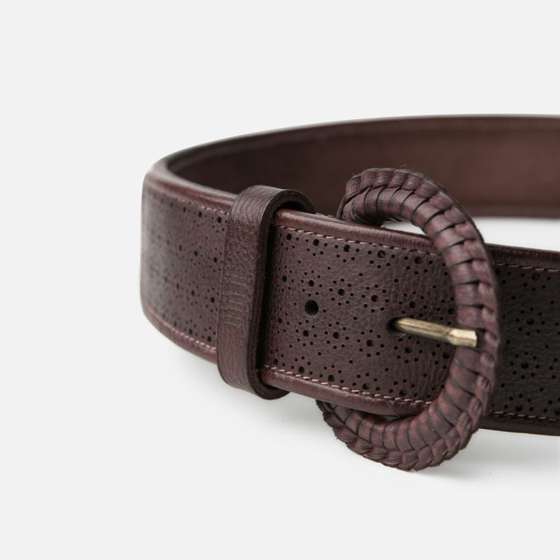 Cowhide belt. Die-cut with floral motif. 5cm wide. Rear screw for manual cutting. Leather-lined buckle.