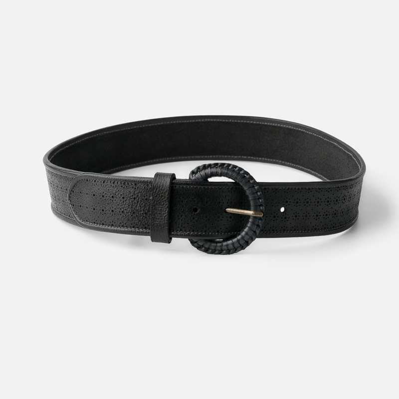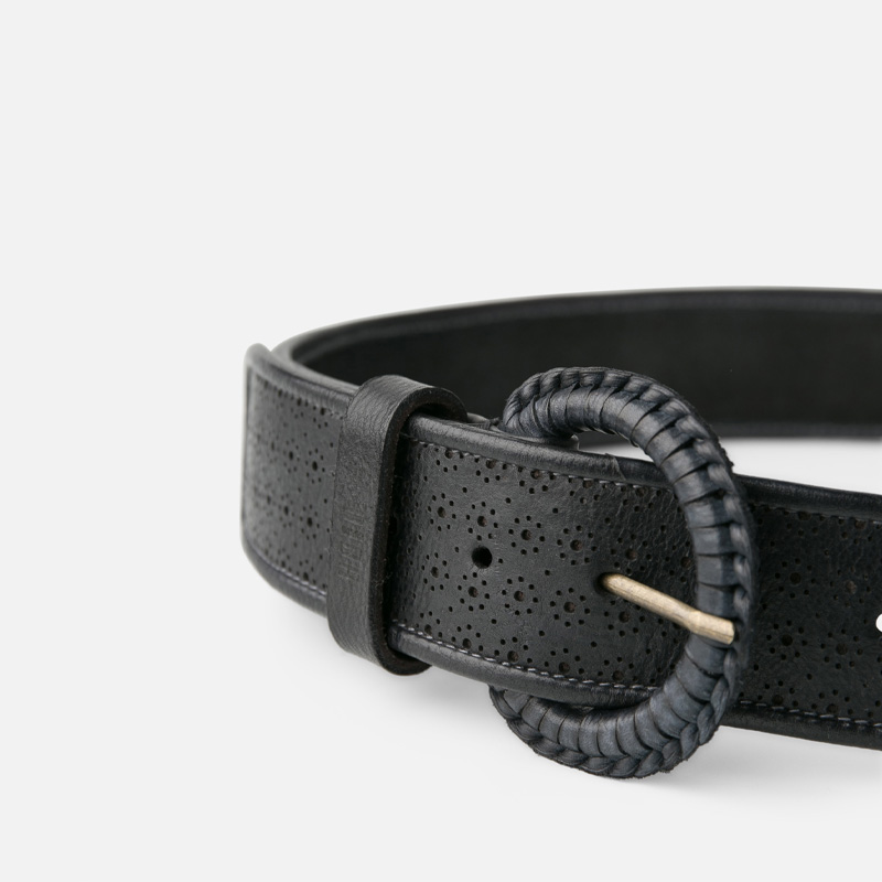 Cowhide belt. Die-cut with floral motif. 5cm wide. Rear screw for manual cutting. Leather-lined buckle.
