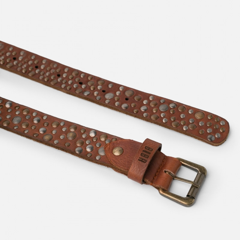 Cowhide leather belt. Back screw to cut it manually. Metallic studs. Old gold rectangular buckle.