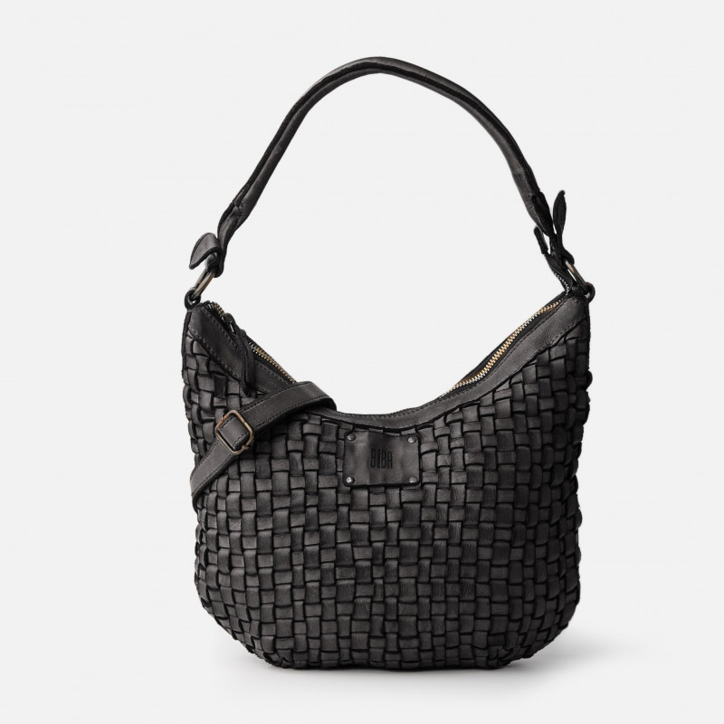 Washed and braided cowhide half moon hobo. Shoulder handle, adjustable and removable shoulder strap. Zipper closure. Multiple external and internal pockets. Cotton lining.