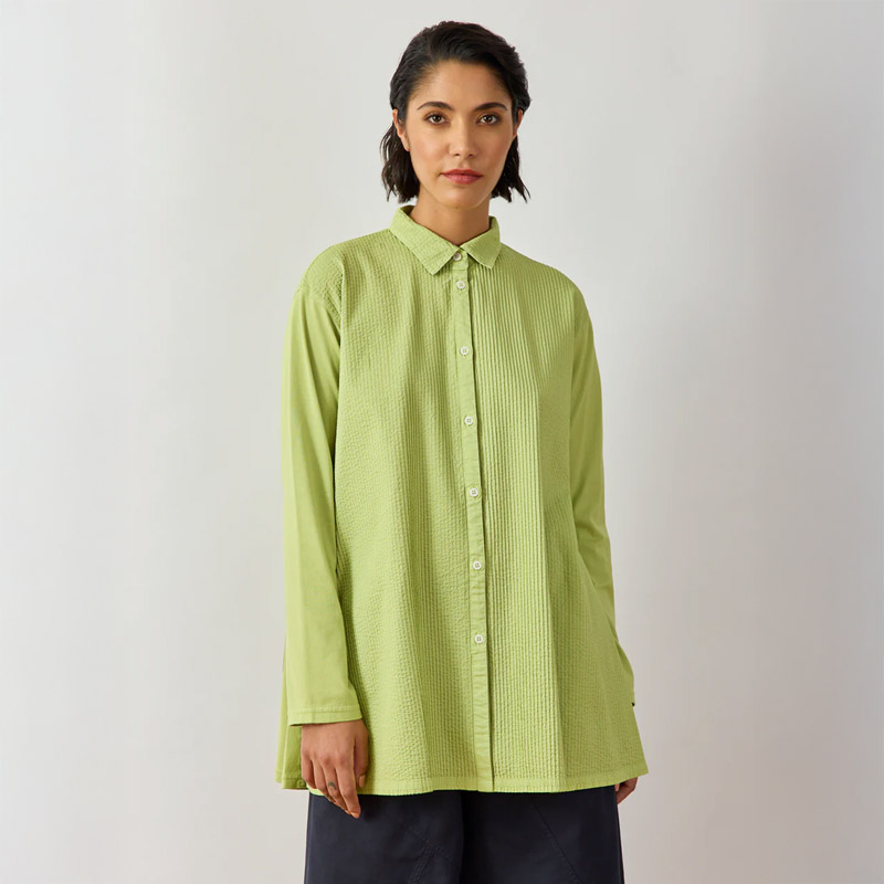 Crafted from pintucked cotton lawn and plain cotton jersey, cut to a flattering longline A-line profile. Pintucks run vertically on the lawn front, and finishing touches—a short collar and a straight hemline with side vents—make it uniquely YaccoMaricard. Finished with a single pintucked back pocket.