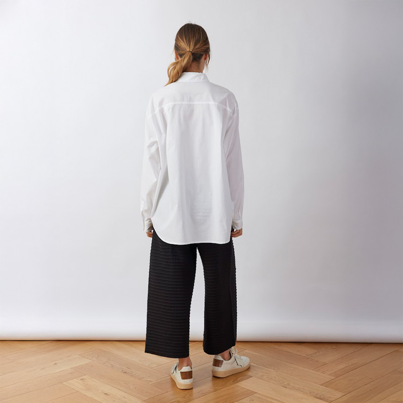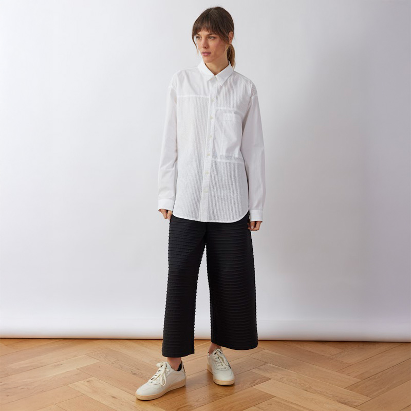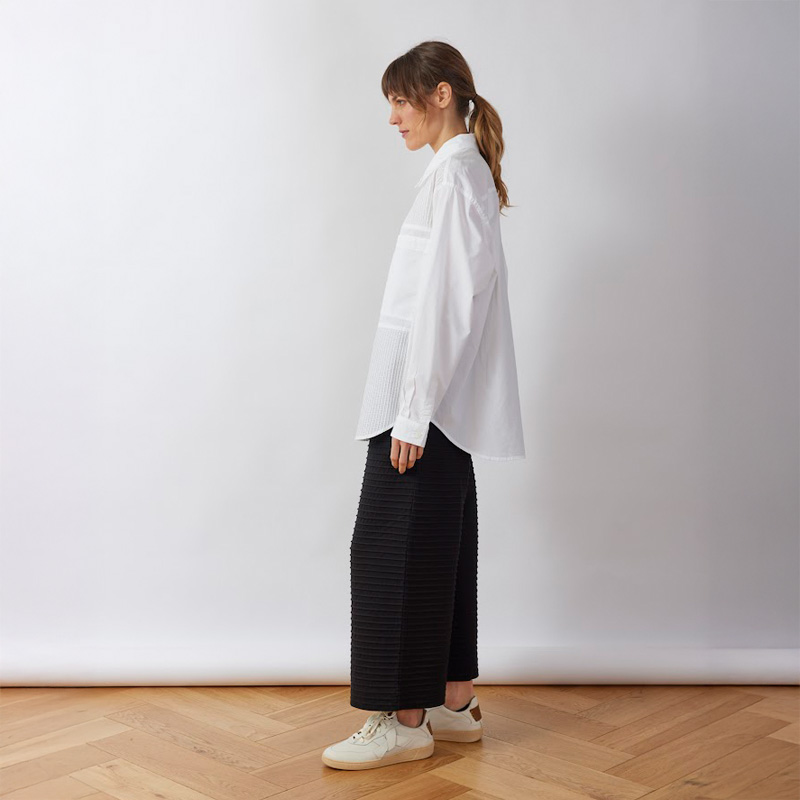 The Myoshu Unisex Shirt explores contrast through horizontally offset pintuck panels, set against smooth plain-weave sections to create a dynamic, modern rhythm across the fabric. The pintuck areas are crafted from cotton lawn, while the plain zones use a slightly heavier shirting cloth called cotton saifu—allowing the garment-dyed finish to reveal subtle tonal shifts and layered depth.