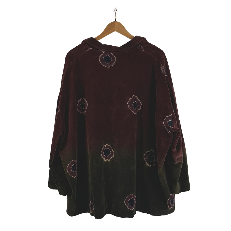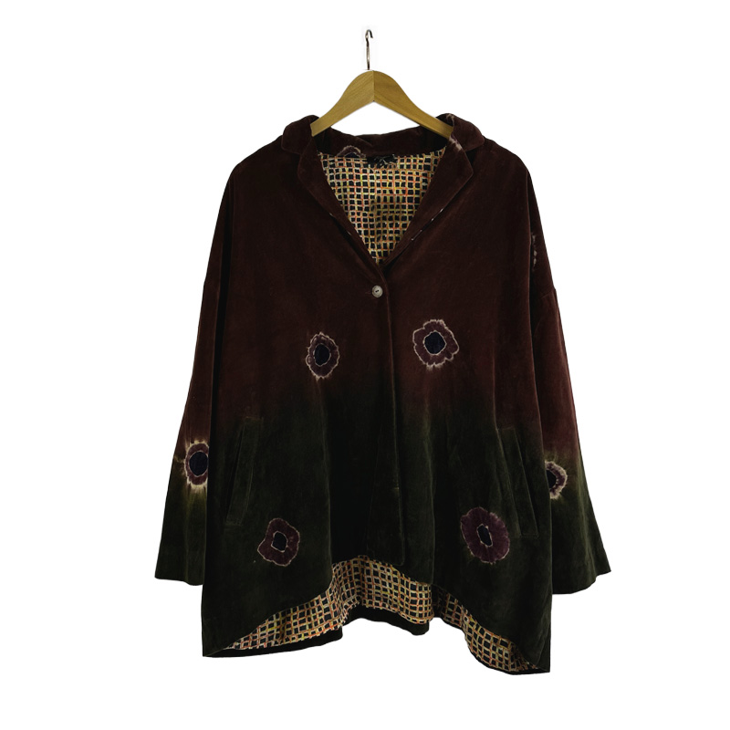 This velvet shibori dyed jacket works for day time or evenings. The fabric has been dyed to give an ombre effect with adstract flowers printed across the body and sleeves.