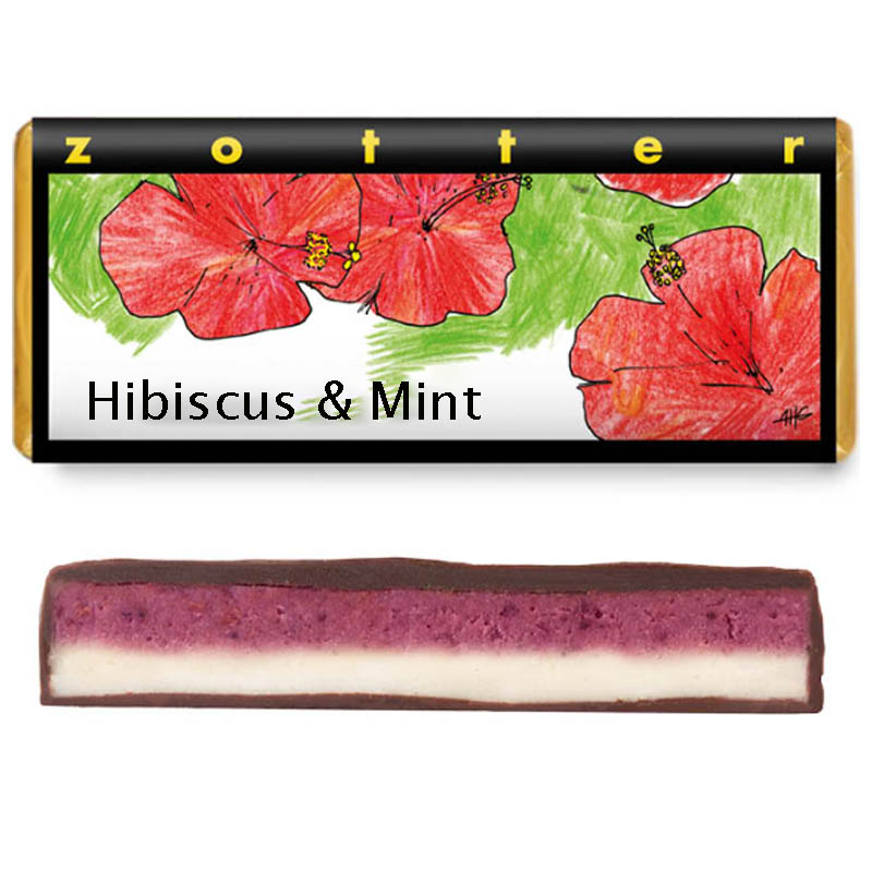 70% Dark chocolate filled with white peppermint cream and hibiscus ganache Tender-melting and simply invigorating: a refreshing white chocolate and mint layer combined with a red hibiscus layer, created by melting hibiscus powder, boiled in milk, with almond praline and white chocolate. It’s completed with a dash of lemon and a sprinkle of salt and coated in a dark chocolate with a 70% cacao content.
