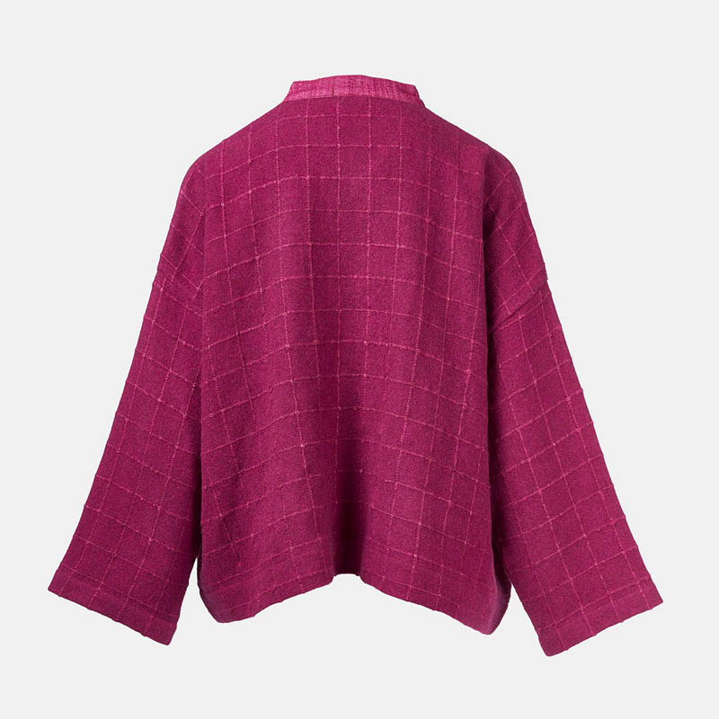 Handwoven wide shirt in yak and hemp checks, a signature TM piece. Featuring a tonal silk tussar asymmetric collar and a single mother-of-pearl button, it effortlessly transforms into the perfect winter cover-up.
