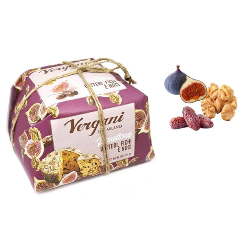 Discover the indulgent taste of Vergani Panettone with Dates, Figs & Walnuts, a festive Italian cake made with premium dried fruits and crunchy nuts. Baked using traditional methods in Milan, this panettone combines the natural sweetness of figs and dates with the richness of walnuts for a unique holiday treat. Wrapped in beautifully illustrated paper, it makes a perfect gift or a centrepiece for your Christmas table.