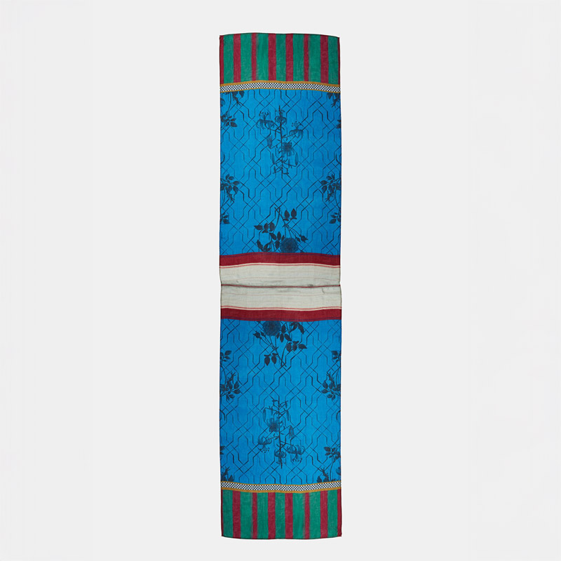 A luxurious 30g tabby silk stole with a TM-exclusive digital print, elevated by contrasting ajours, a gold metallic topstitch along the hem, and a discreet printed logo.