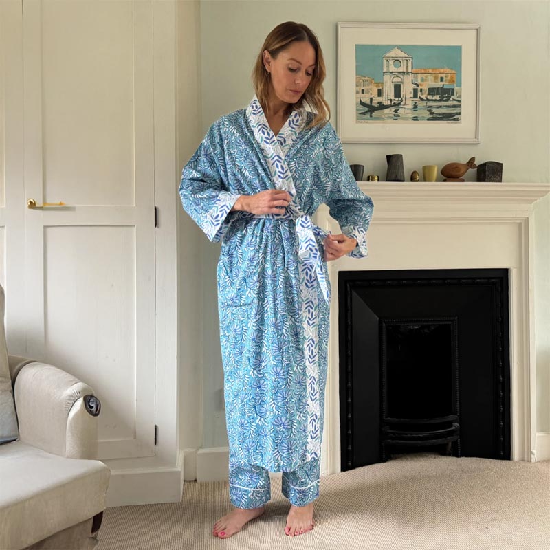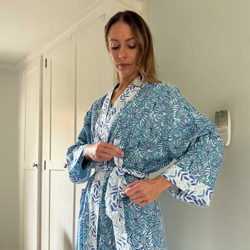 Long kimono, robe or dressing gown, beach cover and more. Made from a brand new colourway of Lime Tree Design's best selling Jaipur design. Designed to wrap round so modesty is preserved - this is the ideal travel kimono. To wear as an on-trend fashion item, team with a white T, jeans and tie it round the back. We love the detailing of the contrast colour trim and tie. It has a patch pocket so somewhere to pop your keys or phone or handkerchief.