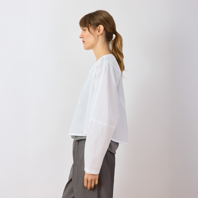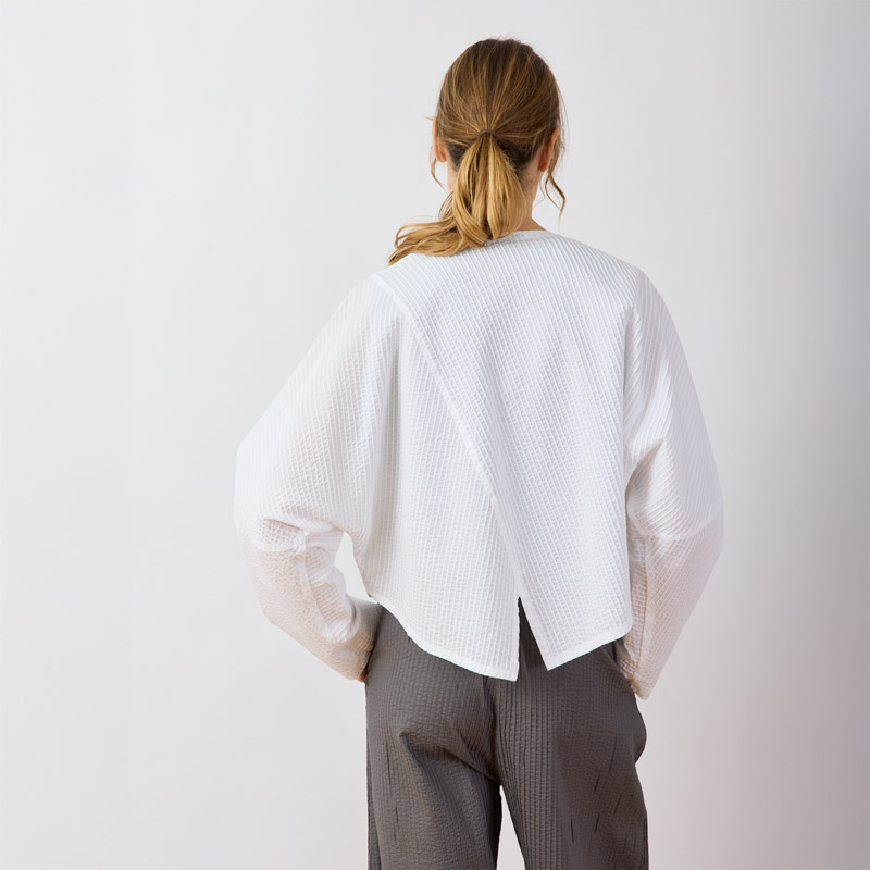 At the back, delicate pintucks intersect diagonally and fall to a central vent, creating a unique design detail that draws the eye and allows for ease of movement. The gently volumised sleeves enhance the relaxed dolman shape, providing comfort and a modern look for all-day wear.