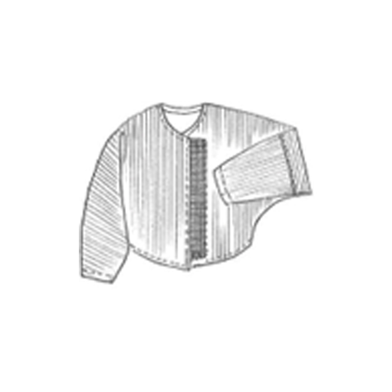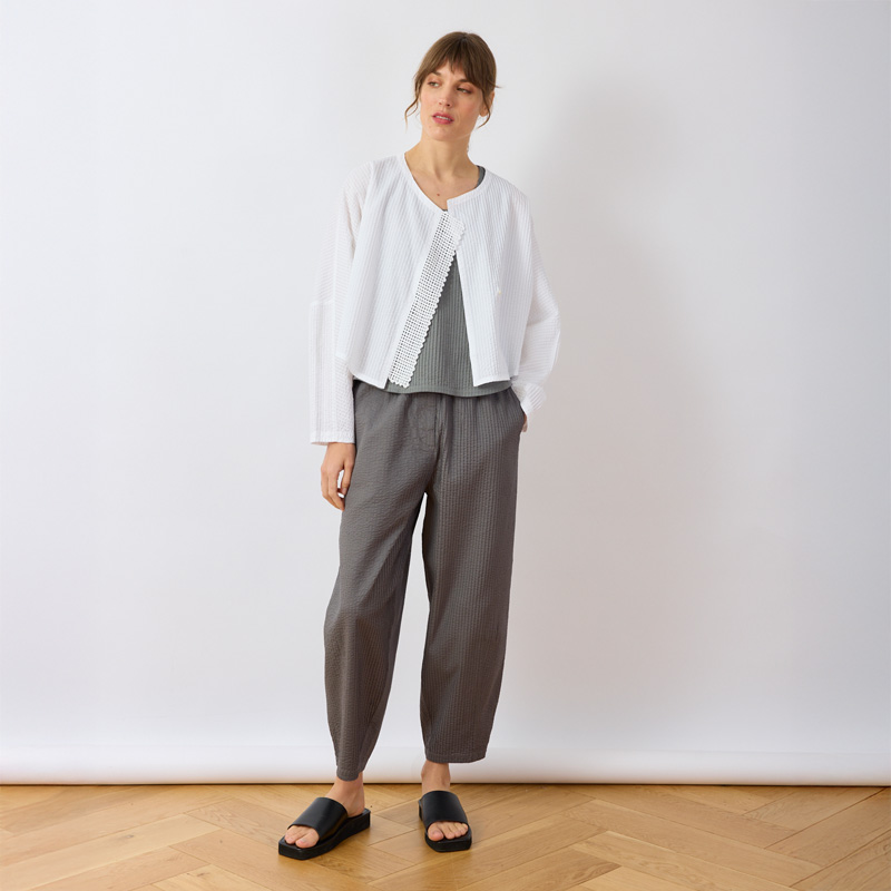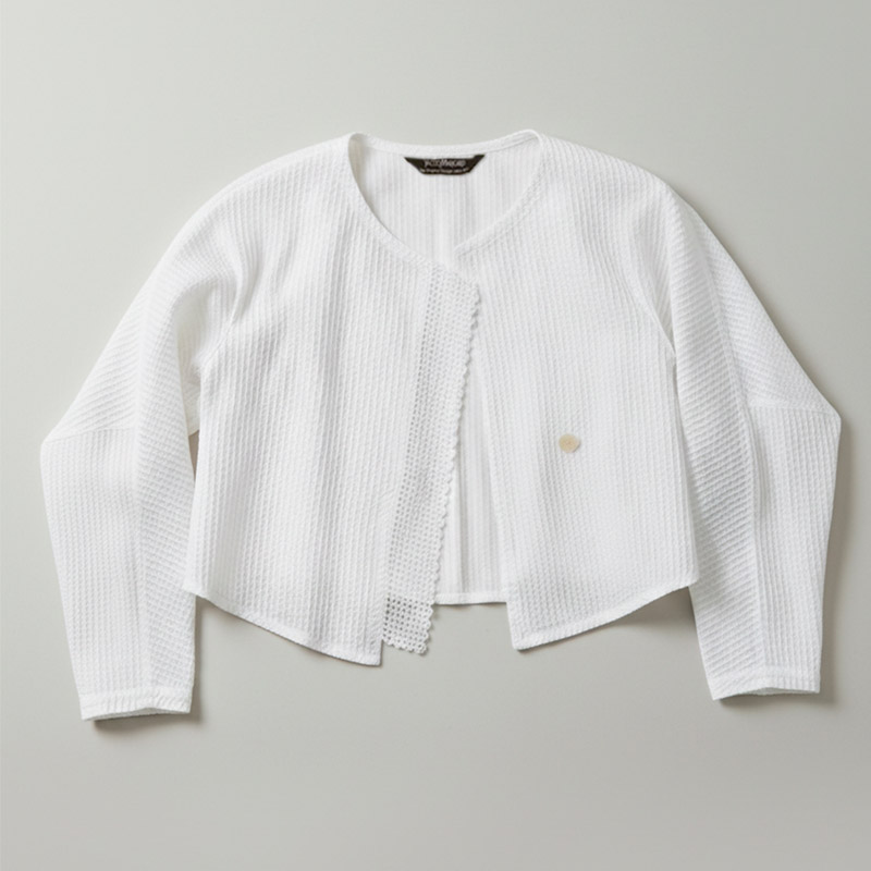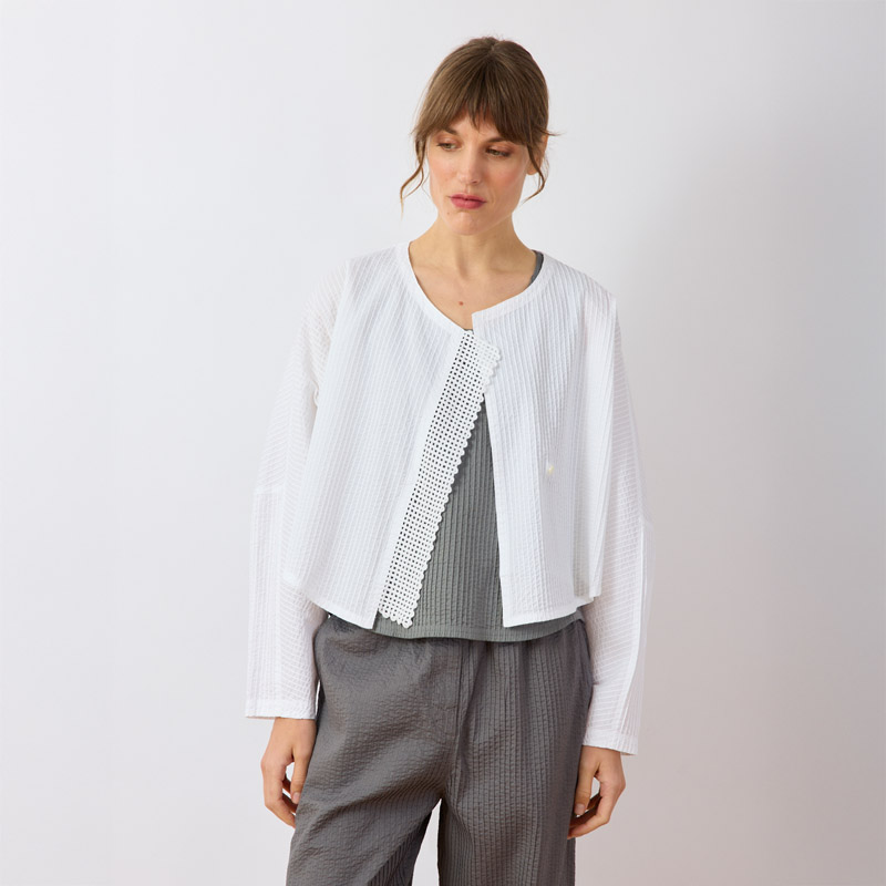 This refined collarless jacket is cut from cotton lawn. It is created by carefully stitching cotton cord onto a water-soluble sheet. When washed in the garment-dye process, the sheet disappears, leaving a striking mesh motif.