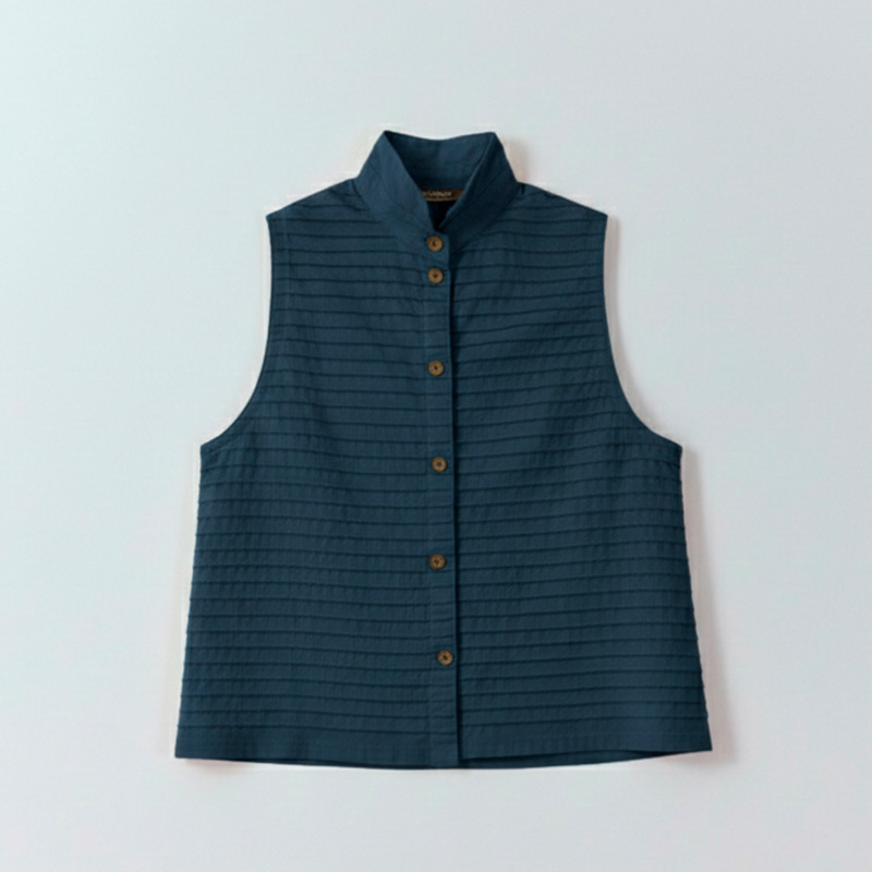 The Kantan Jersey Waistcoat, constructed from soft cotton jersey with all-over pintucks, offers a boxy fit and generous armholes for easy layering. Its length balances perfectly with summer trousers. The short stand-up collar in lawn fabric can be worn up or turned down for added interest. The straight hemline features side splits. Colour is achieved using a garment-dye process for a softer hand feel.