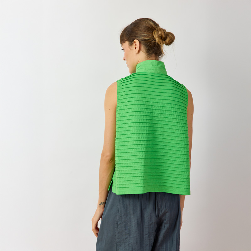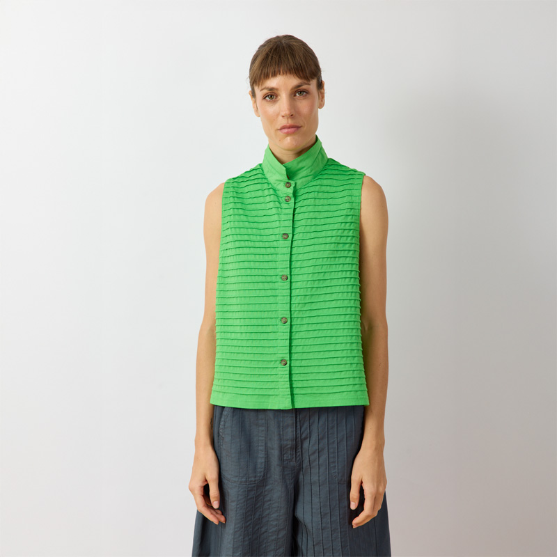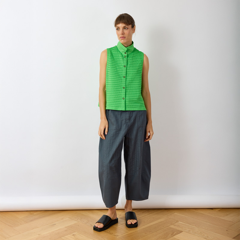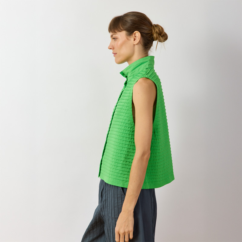 The Kantan Jersey Waistcoat, constructed from soft cotton jersey with all-over pintucks, offers a boxy fit and generous armholes for easy layering. Its length balances perfectly with summer trousers. The short stand-up collar in lawn fabric can be worn up or turned down for added interest. The straight hemline features side splits. Colour is achieved using a garment-dye process for a softer hand feel.
