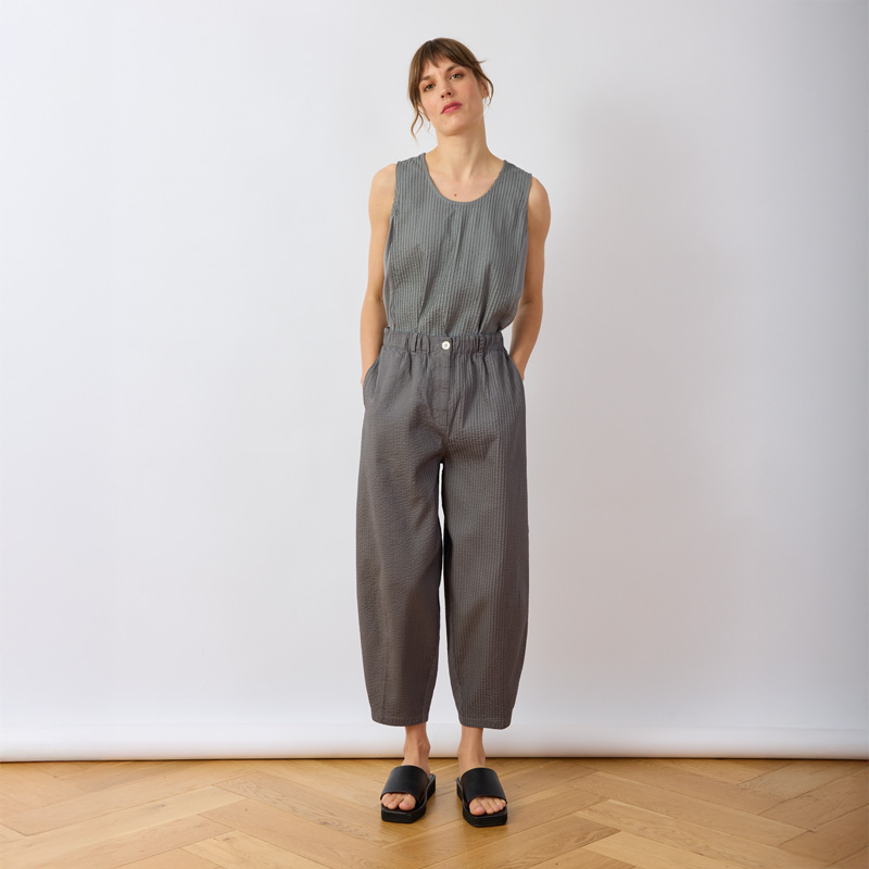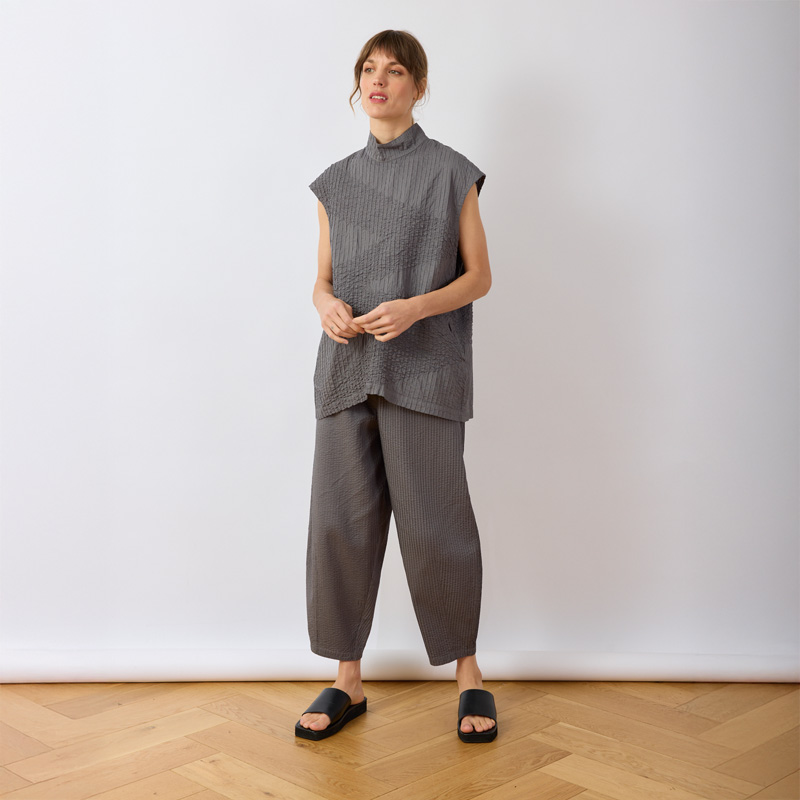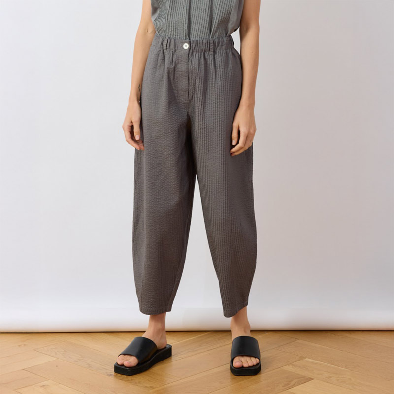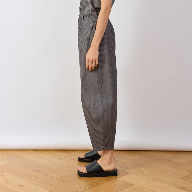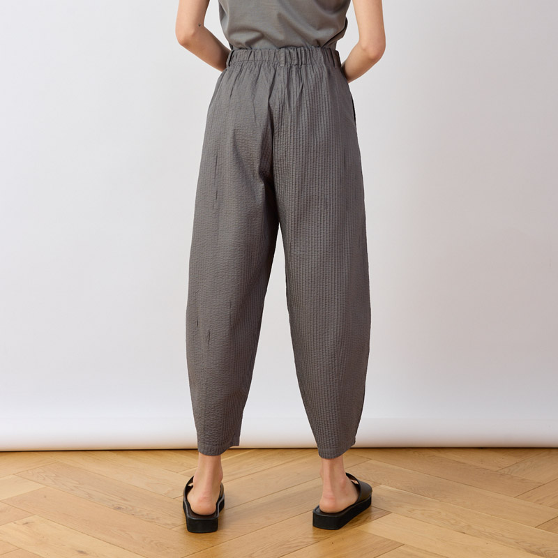 YaccoMaricard's Bareru Trousers are crafted from exquisitely pintucked cotton lawn. They combine detailed richness with the cloth's lightness, ensuring cool comfort all day. The flattering tapered profile uses darts to form a sculptural, oval silhouette with a modern edge. This shape enhances movement and adapts easily to different looks, making the trousers versatile for styling.