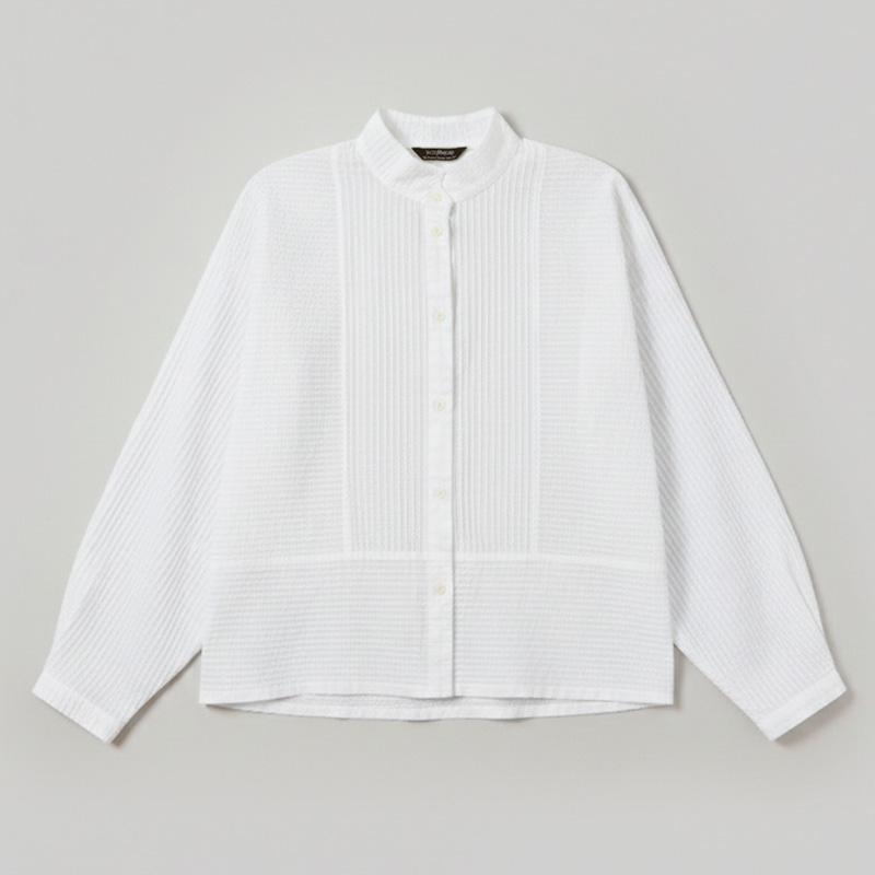 Generously cut from lightweight cotton lawn, the Bibbu Shirt is one-size and defined by thoughtful panel work and precise pintucks that flow seamlessly into the sleeves, finishing at a crisp buttoned cuff. This expertly crafted detailing shapes a silhouette that easily transforms from classic shirt to effortless overshirt.  Finished with a stand-up collar.