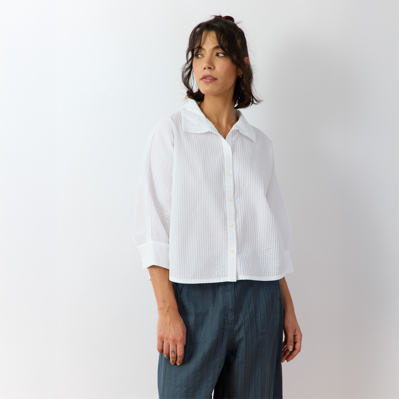Cut from cotton lawn, the Bura Shirt offers an easy, cropped, off-body profile with no shoulder seam for a precise, uninterrupted line. Every panel is fully pintucked. Its collar naturally folds back, lending a soft, relaxed neckline. Three-quarter sleeves curve gracefully and end in neat buttoned cuffs, balancing polished structure with relaxed movement. Pairs seamlessly with high-rise tailoring or statement trousers.