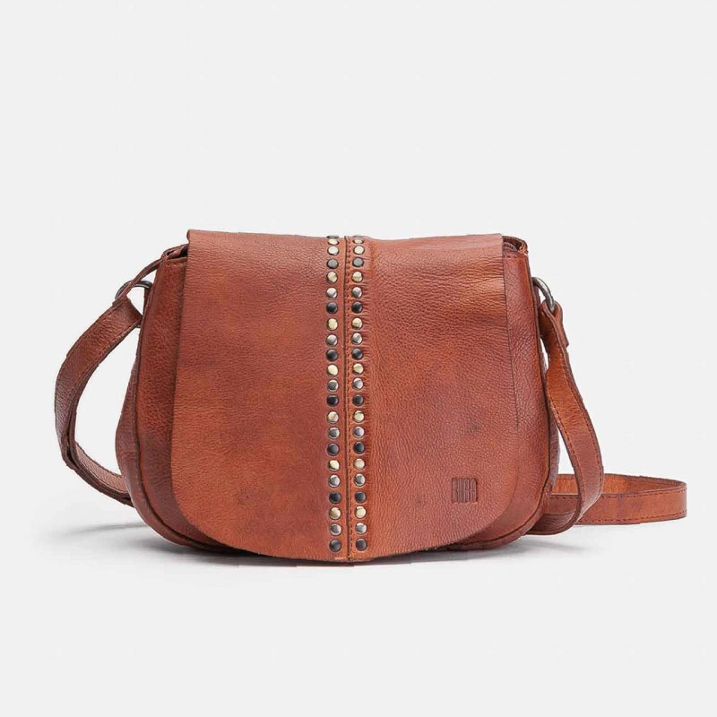 Washed and vegetable-tanned cowhide leather cross bag. Flap with studs, adjustable shoulder straps, zip closure, external and internal pockets, and cotton lining.