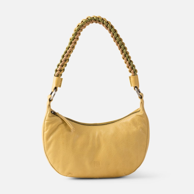 Washed cowhide leather hobo bag. Fixed braided shoulder strap. Adjustable and detachable crossbody strap. Zip closure. Interior pockets. Cotton lining.
