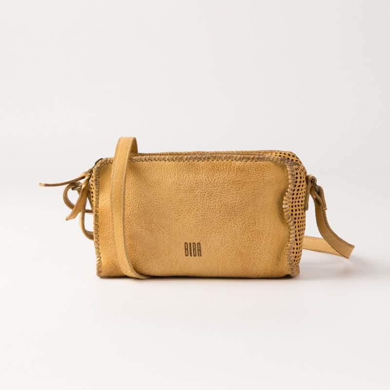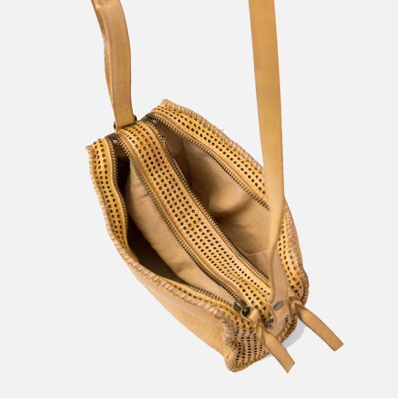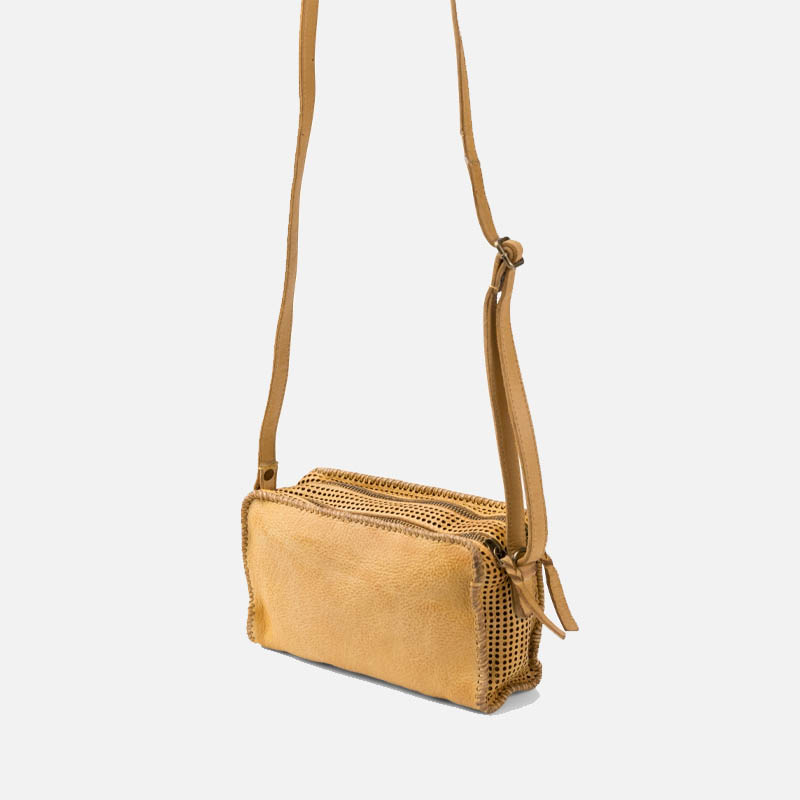 Washed and perforated cowhide crossbody bag. Two zippered compartments. Adjustable strap. Cotton lining.
