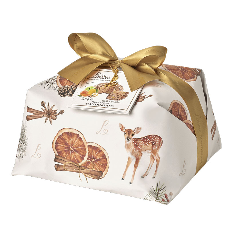 For Loison's Royal Line, the most delicious top ingredients are used, following a special production process that utilizes the most modern and advanced systems. The panettone is a naturally leavened product, with the typical shape of panettone, and a typical cross cut across the surface. The yellow dough is enriched with orange peel from Sicily, citron from Calabria and Sultana raisin covered with italian almonds, icing and sugar grains. The traditional Panettone is handwrapped in ivory paper.