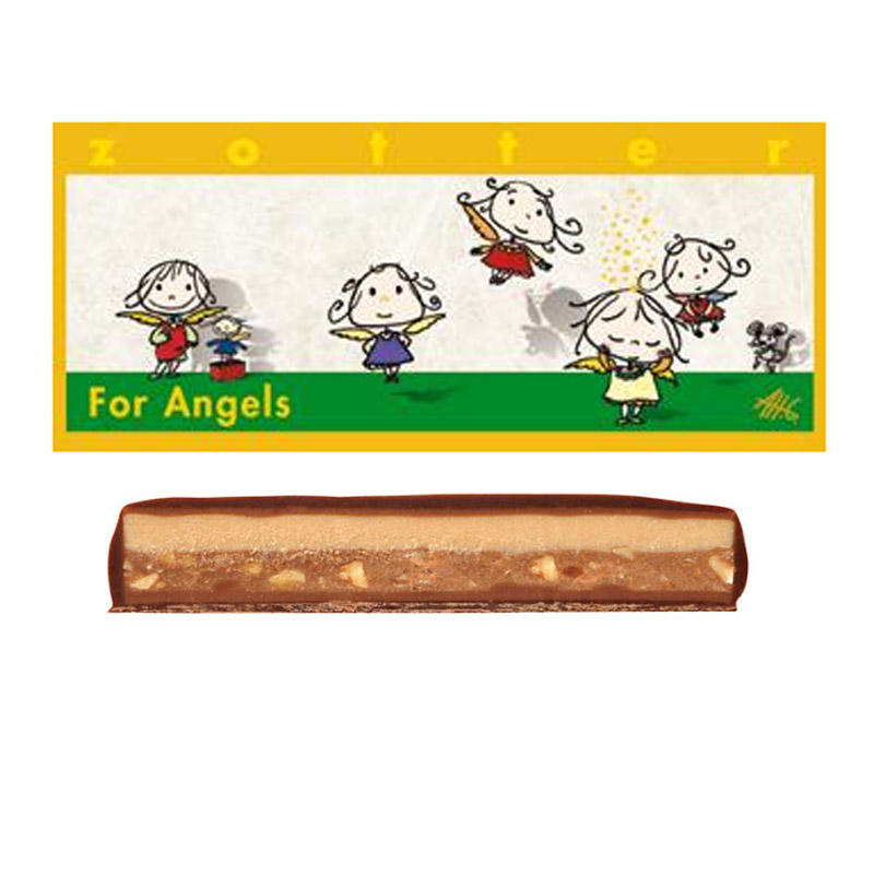 Angels love nuts too: alternating layers of light almond praline and dark hazelnut praline, deliciously crunchy and enhanced with chopped hazelnut brittle, and dunked in an intense, dark milk chocolate with a rich 60% cacao content.